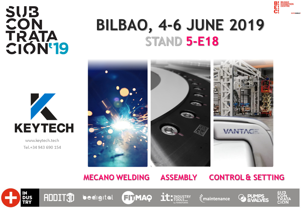 Keytech presente en la Subcontratación'19, feria internacional sobre procesos y equipos para la fabricación que se celebra entre el 4 y el 6 de junio en el Bilbao Exhibition Centre. Desde los procesos más básicos en subcontratación industrial hasta las tecnologías más avanzadas, procesos completos de fabricación así como equipos y suministros para fundición, forja, laminación, tratamientos, soldadura y manipulación. Encuéntranos en el stand 5-E18 .